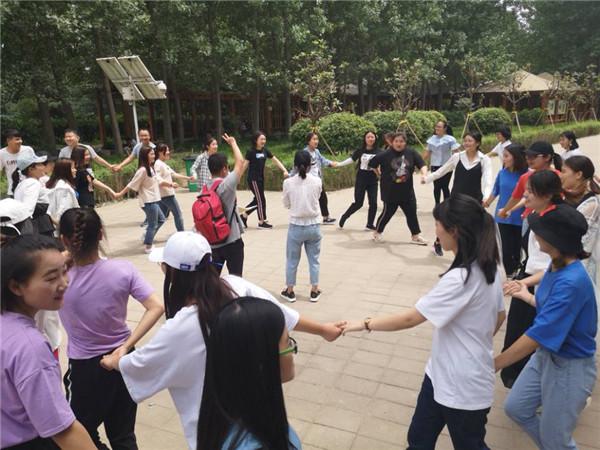 午饭后,大家乘车从省博物院赶到黄河湿地公园,在康千老师的引导下,此次拓展安排了三个篇章,六项活动。活动中,所有同学尽心尽力,团结拼搏,努力付出。此次活动中每人都取得了自我突破,获取了自我体会。第一个篇章,通过让所有同学手拉手围成两个同心圆圈,彼此寻找伙伴,抱团介绍,促进了大家的感情。第二个篇章,通过耳语传话,考验了大家的默契度,同时加强了大家的责任意识。在最后一个篇章---“蒙眼行走”,在伙伴的搀扶下,大家穿过黑暗,跋山涉水,穿过平地,走过沟坎,踏过木地板,历经了40多分钟的跋涉,到达终点,摘开眼罩,一望无际的黄河呈现眼前。通过此项活动让同学们明白了团结协作的重要性。