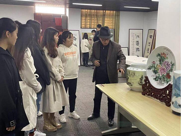 许挺教授与学生亲切交流 在展出过程中,20 19级小学教育专业学生的书法作品得到了许挺教授的赞许,许教授邀请她们到工作室交流,并对她们的书写进行指导。对学生进行指导的过程中,许挺教授以他在景德镇多年的学习和创作为例,为同学们分享学习书法的经验,分门别类为学生讲述创作历程,并留下了学生的联系方式,以便后续指导学生的书画学习。