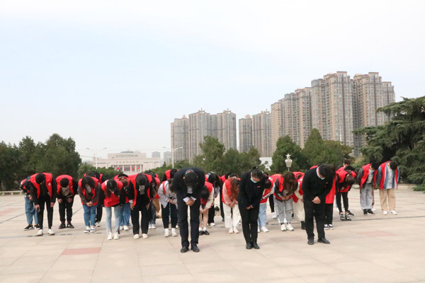 学院师生党员向革命先烈鞠躬默哀 签约仪式结束后,在工作人员带领下,互联网金融学院师生党员前往郑州市烈士陵园缅怀革命烈士。