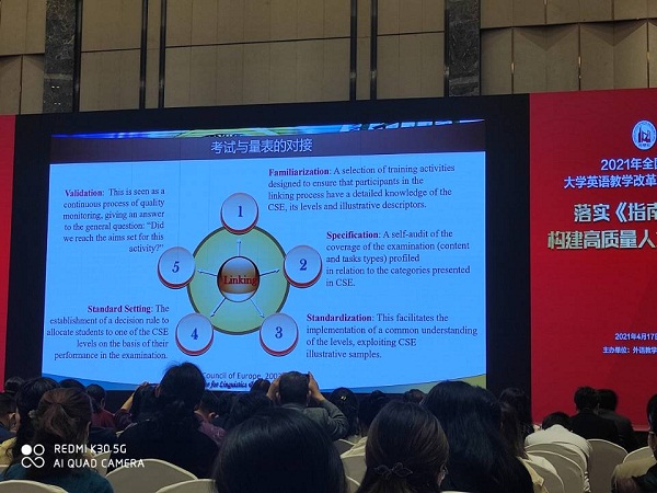 教育部高等学校大学外语教学指导委员会副主任委员刘建达教授结合中国英语能力等级量表在日常英语教学中的应用作了关于“科学有效应用《量表》,提升教学测评质量”的主题发言。刘教授着重强调了中国英语能力等级量表的开发对于教学和测试的反哺作用,并提出各高校结合院系和学生的实际情况,确定具有本校特色的教学目标和教学要求。