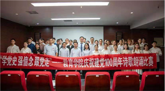 为庆祝中国共产党成立100周年,深入贯彻党史学习教育动员大会精神,在青年学生中深入开展“学党史、强信念、跟党走”系列活动,激发爱党爱国情怀,鼓励青年学生为实现“两个一百年”奋斗目标、实现中华民族伟大复兴的中国梦贡献青春智慧和力量。5月8日中午,教育学院于图书馆502视听室举办“学党史、强信念、跟党走”庆祝建党100周年诗歌朗诵比赛。院党总支书记丁青山、副书记曹亮、副院长郑琳娜、团总支书记胡亚东、全体辅导员以及部分师生代表参加了此次比赛。