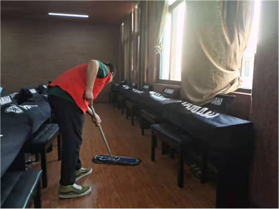 志愿者在图书馆整理摆放书籍。学院志愿者们分成小组,有序配合,整理书籍。一部分志愿者负责将书籍归位,一部分志愿者负责检查书籍顺序。一番劳动,大家的手上虽然布满灰尘,但心中却充满奉献后的暖意。随后,志愿者对学院教学楼的书法和钢琴教室展开了清扫活动。志愿者分工合作,互帮互助,仔细清扫教室的每个角落。