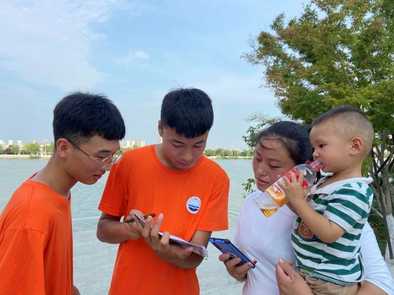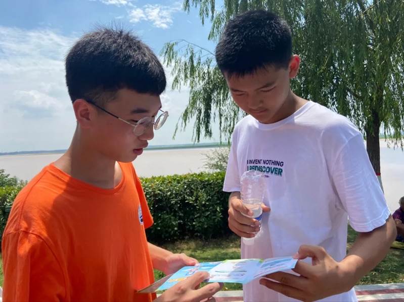 河边之行,慎于足下。7月16日,队员们到达景区后,向游客发放《珍爱生命,预防溺水》安全知识宣传彩页,并开展防溺水知识宣讲,向游客们讲解了溺水者的主要特征及被救上岸后的紧急援救措施。此外,队员们还在黄河湾景区开展了实地调研活动,了解到该景区每五米设立一个防溺水警示牌;黄河边护栏上配备有救生衣、救生圈、救生绳等应急救援物品;黄河下游附近设置有东坝头险工工程管理处、保护范围标示牌、防溺水警示牌以及防溺水站等。此次调研丰富了调研数据,并为今后防溺水活动提供了新思路。