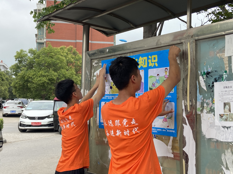 团队成员在清水河小区粘贴防溺水知识海报