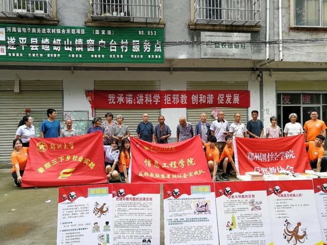 为贯彻落实反邪教工作的方针政策及有关文件精神,加强高校反邪教宣传教育,营造浓厚的防邪、反邪社会氛围,7月27日,信息工程学院“反邪教联盟”暑期社会实践团在驻马店市遂平县开展了为期7天的社会实践。8月2日,“反邪教联盟”暑期社会实践活动圆满结束。