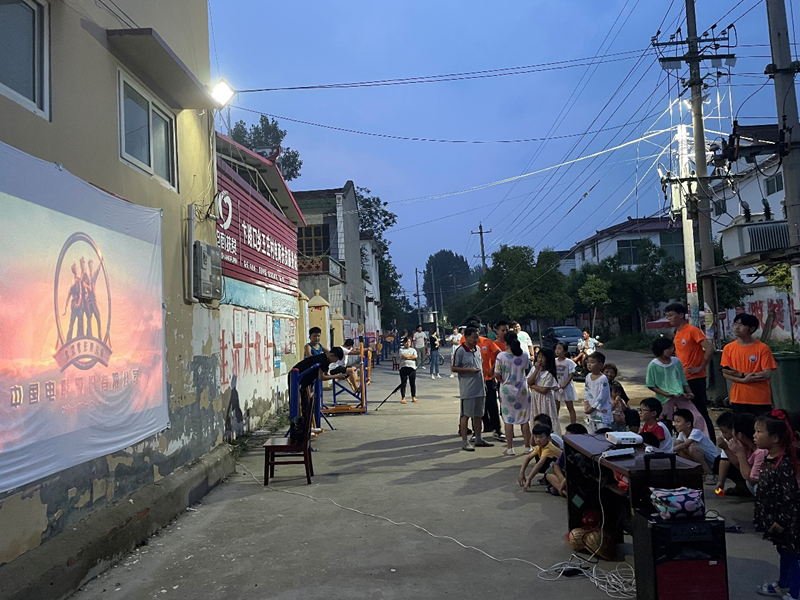 实践团成员在王庄村播放主题励志电影《一点就到家》