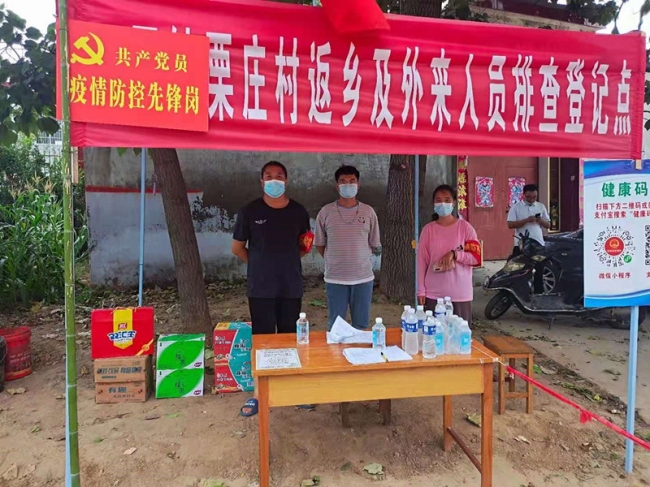 栗晨阳(中)在疫情防控出入口值班