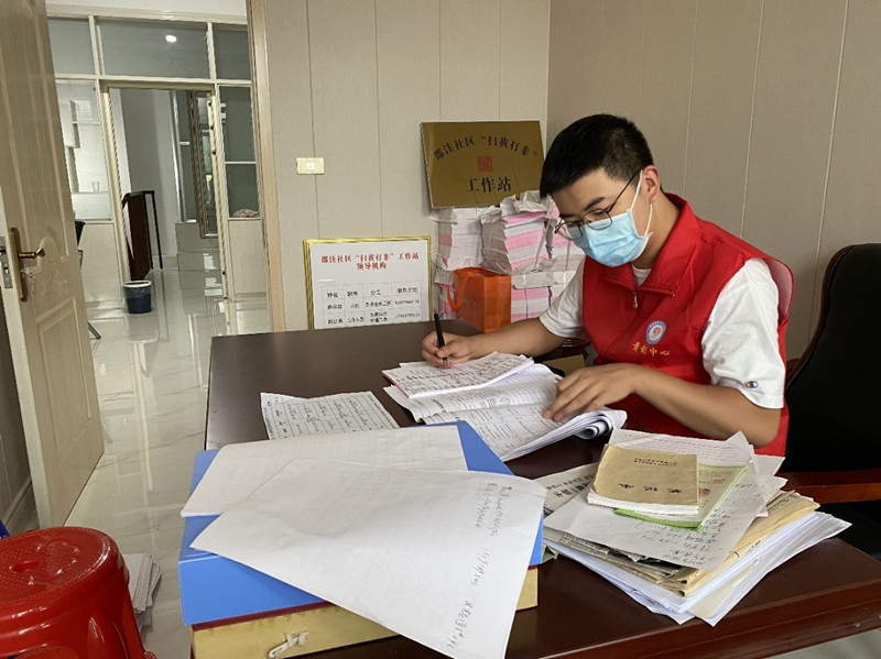 陈诚正在对社区老人疫苗接种情况进行回访登记