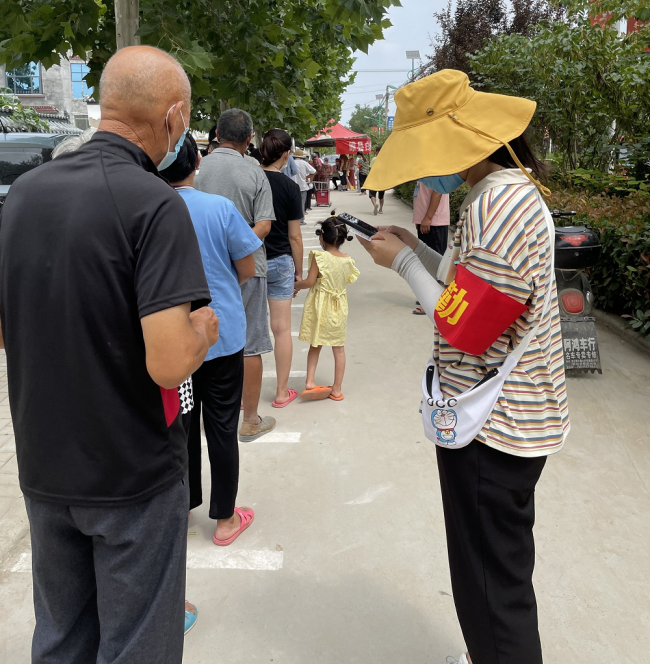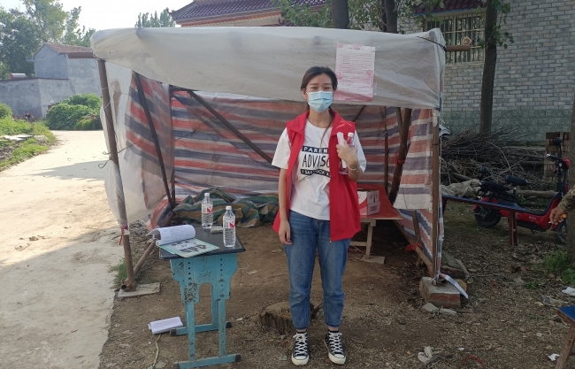 刘婷婷,18级英语本5班的学生,也是在商丘市睢县白庙乡参与疫情防控的志愿者。7月16日,她主动加入了睢县防汛救灾青年突击队,时刻为防汛救灾做准备;7月25日,在睢县铁人三项广场防汛救灾应急演练中,成为一名志愿者;后来商丘疫情加重,听说村里急招志愿者,刘婷婷于8月2日至今一直参与在家乡疫情防控工作当中,辅助村委协调组织村民进行核酸检测,帮助中老年人扫码登记,在路口登记来往人员的信息、测量体温,并被派往白庙乡政府统计返乡人员数据。她说,从抗洪到抗疫,她被发生在身边的一幕幕感动着,无论是党员干部还是青年志愿者身上无不体现着:团结一致定能攻克难关,灾难当前,要勇于担当。