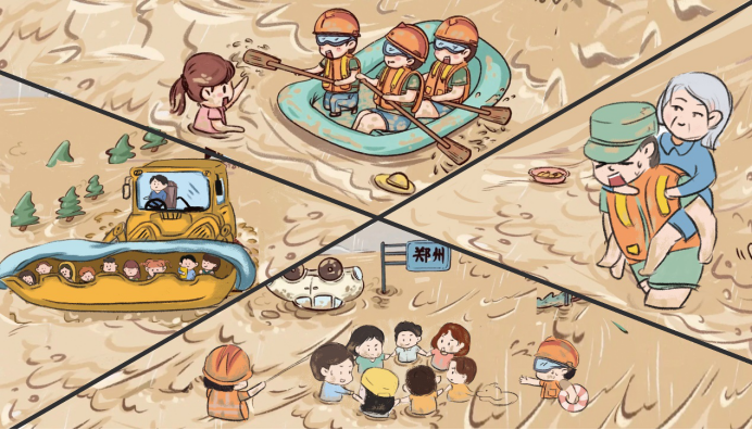 作品采用对角线分割画面,四幅采用卡通人物的形象,更加突出人物的表情、动态特点。画面采用暖色为主,冷色为辅,传达出抗洪救灾中的温暖。辅之少部分冷色,产生视觉冲击。用这幅画记录抗洪最美瞬间,最美的身影。