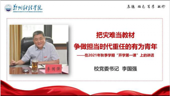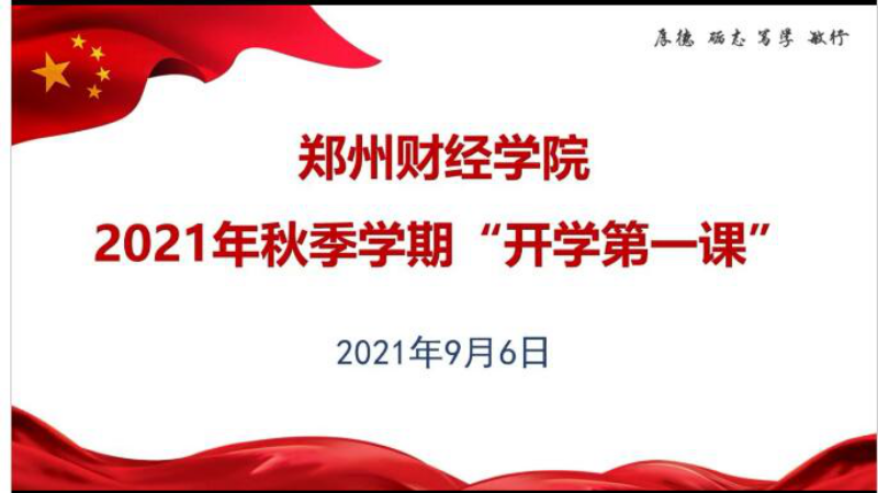 上午9:00,威廉希尔官网2021年秋季开学第一课正式开讲,学校监事会主席李庆阳主持课程。在嘹亮的国歌声中,管理学院师生在不同场合站立注目鲜艳的五星红旗,同唱国歌参加升旗仪式。随后,学院师生收看了河南省教育厅厅长郑邦山的讲话视频,牢记“把立德树人作为根本任务,用大爱育人心,与中原同崛起;把灾难当教材,与祖国共成长”嘱咐。