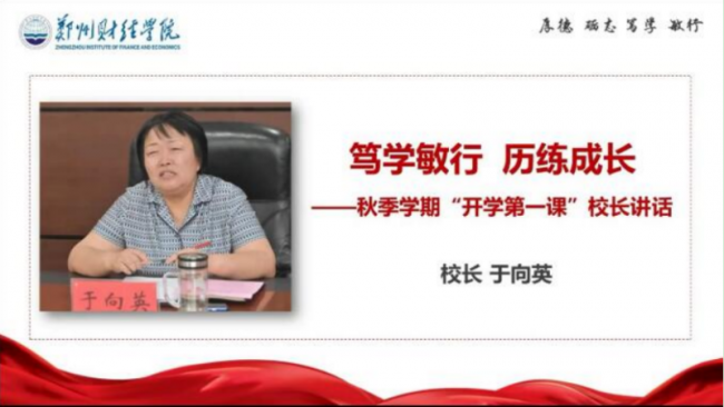 校长于向英发表题为《笃学敏行,历练成长》的讲话,寄语全校师生要身居斗室,心怀理想,要千里之行、始于足下,要锻造意志,坚忍不拔,要科学防控、身心健康。