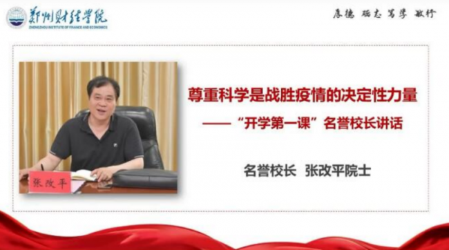 学校名誉校长张改平院士寄语师生要永远跟党走,科学参加疫情防控,科学安排学习生活,希望师生以高度责任感为国家、为社会、为个人奋斗、拼搏。