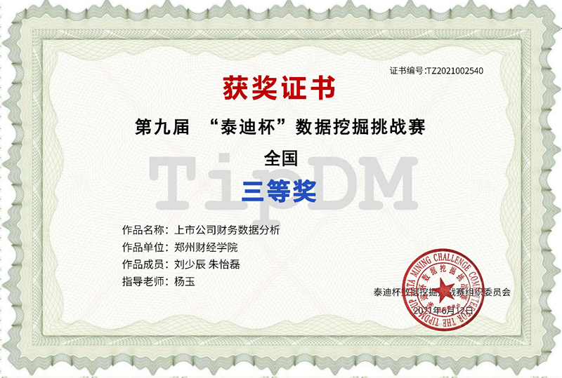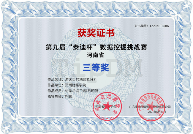 今年7月份,第九届“泰迪杯”数据挖掘挑战赛完美落幕,信息工程学院18级数据科学与大数据技术专业学生在此次比赛中取得佳绩。其中房飞越、欧明健、刘泽龙的作品在学院许鹏老师的指导下,获得河南省三等奖;刘少辰、朱怡磊的作品在杨玉老师的指导下,获得全国三等奖和河南省二等奖。