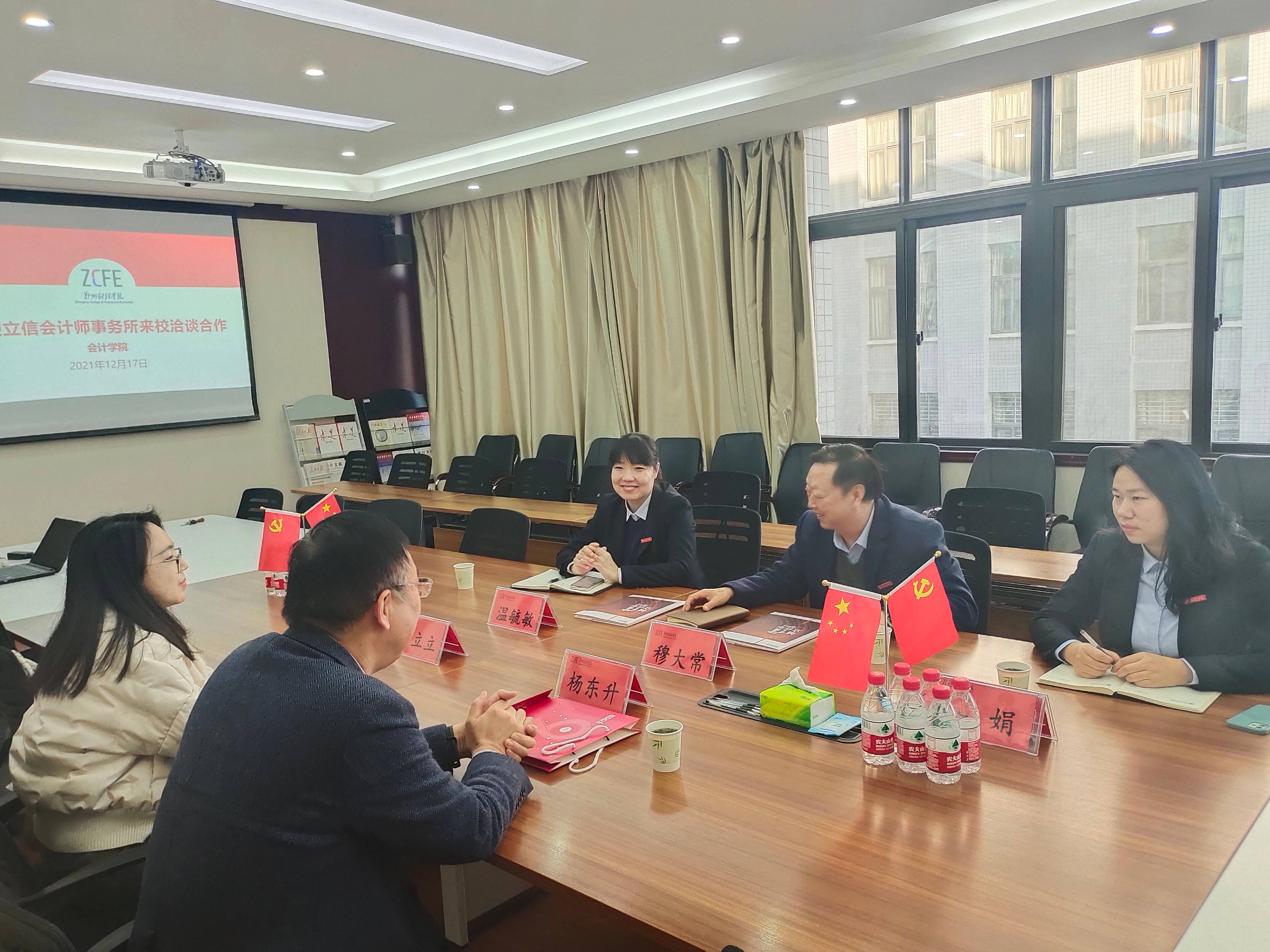 12月17日,立信会计师事务所(特殊普通合伙)河南分所所长杨东升、副所长刘立立一行来威廉希尔官网会计学院洽谈校企合作,学院院长穆大常、党总支书记温毓敏、副院长王娟参加此次洽谈会。