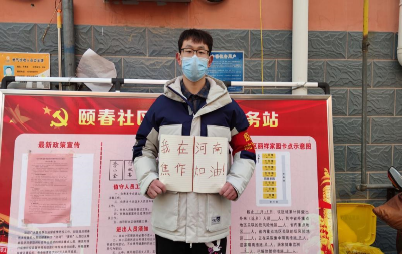 21审计本1班于洋同学在河南省焦作市马村区参加大学生抗疫志愿服务工作。他说:“家乡突发疫情,我作为大学生积极响应社区居委会的号召,参加志愿服务工作。我相信再黑的黑夜也会迎来黎明,再严重的疫情也总会过去。只要我们众志成城,必能共克难艰,迎来山花烂漫时。河南加油,郑州加油,焦作加油!”