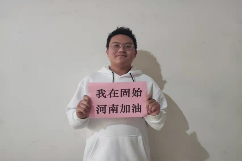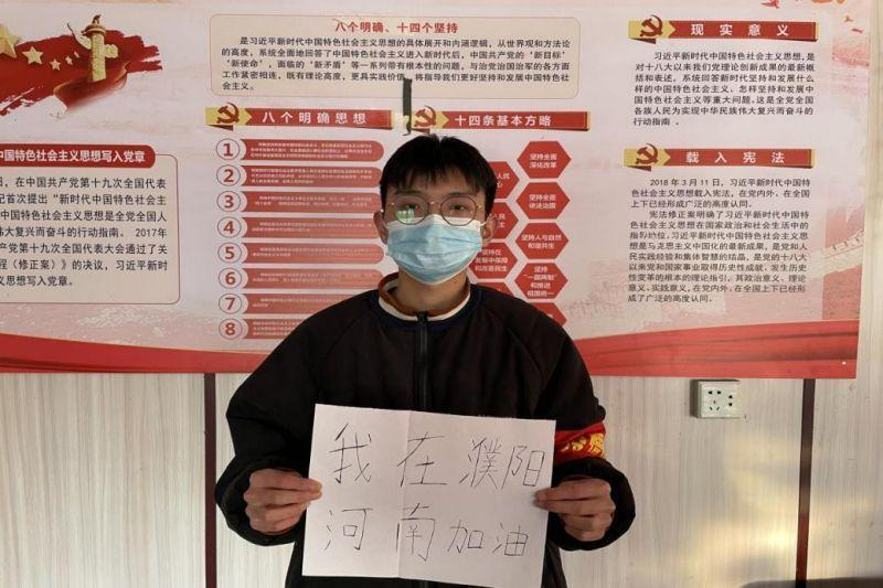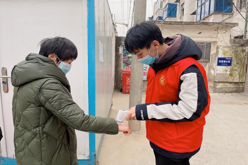 21财管本1班梅釴锟在河南省信阳市固始县胡族铺镇参加防疫志愿工作。他说:“在被奋战在一线的广大医务工作者和抗疫工作人员的一次次‘逆行’和无数壮举感动的同时,我也为自己积极参与疫情防控志愿活动感到自豪。我相信,全国人民万众一心、众志成城,定将取得最后的胜利。”