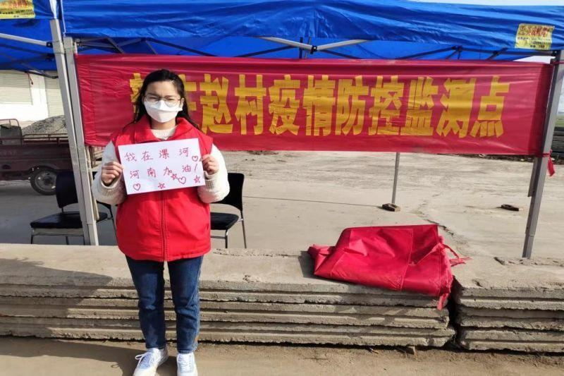 20财管本2班赵梦瑶在漯河市参加防疫志愿工作。她说:“很荣幸能够再次作为志愿者为疫情防控工作贡献自己的一份力量。我主要负责在村口执勤,对来往人员进行登记,并测量体温。在志愿活动中,我培养了责任心,磨炼了耐力,进一步提升了个人能力。我相信疫情定会消失,愿国泰民安,一切顺遂!”