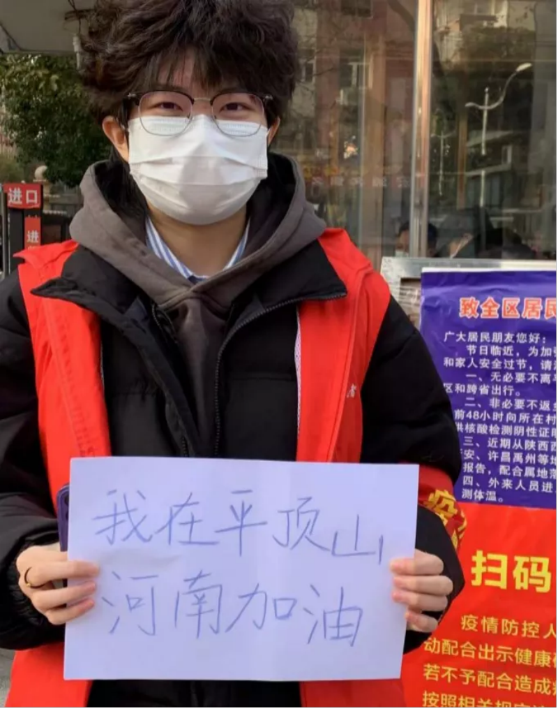21会计本5班张子腾在南阳市四里店镇余庄村参加疫情防控志愿工作。她说:“作为新时代青年,我愿为祖国的基层工作贡献自己的青春力量。在这个关键时期,我们应该勇敢地站出来,肩负责任、勇挑重担,积极参与到志愿服务活动中,助力家乡疫情防控工作。”
