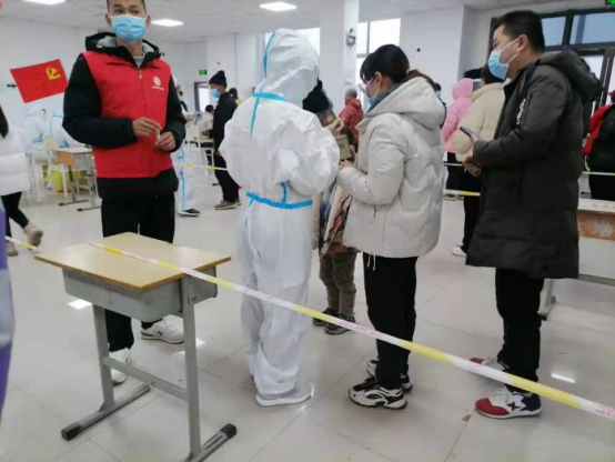 2021级金融学本科1班孙瑜悦跟随防疫志愿队于滑县道口镇解放南路社区协助医护人员进行核酸检测排查和人员信息登记。她说:“在这次志愿活动中,我第一次穿上防护服为人民群众服务,内心既激动又紧张,亲身体会到了医护工作人员的不易。参加志愿服务活动虽然很累,但看到家乡越来越好,就觉得所做的一切都是值得的。疫情还在继续,我也会坚守自己的岗位,尽自己所能为人民服务。疫情不散,我们不退,请党放心,抗疫有我!”