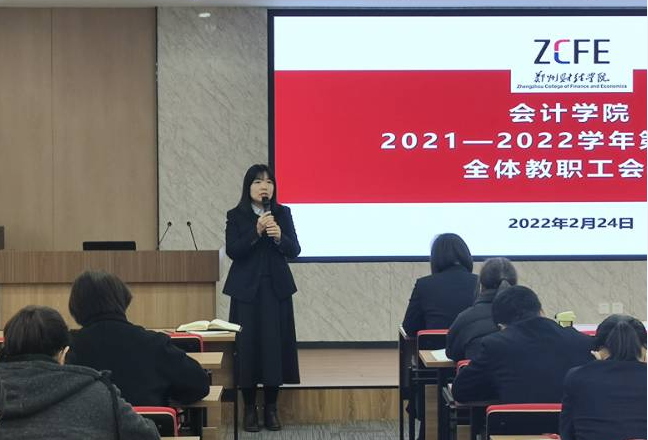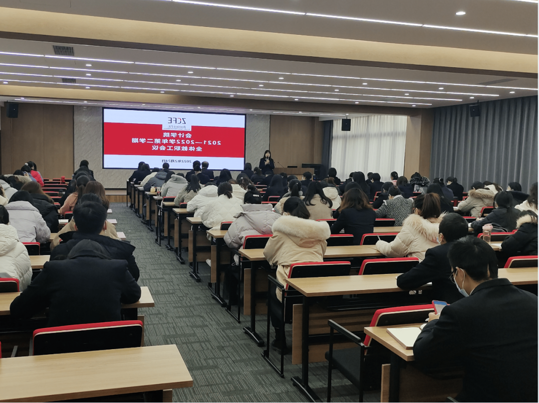2月24日上午,会计学院在德正楼第一学术报告厅组织召开新学期全体教职工会议,传达落实学校会议精神,安排部署新学期重点工作。会计学院领导班子成员,学院全体教职工参加会议,会议由温毓敏主持。