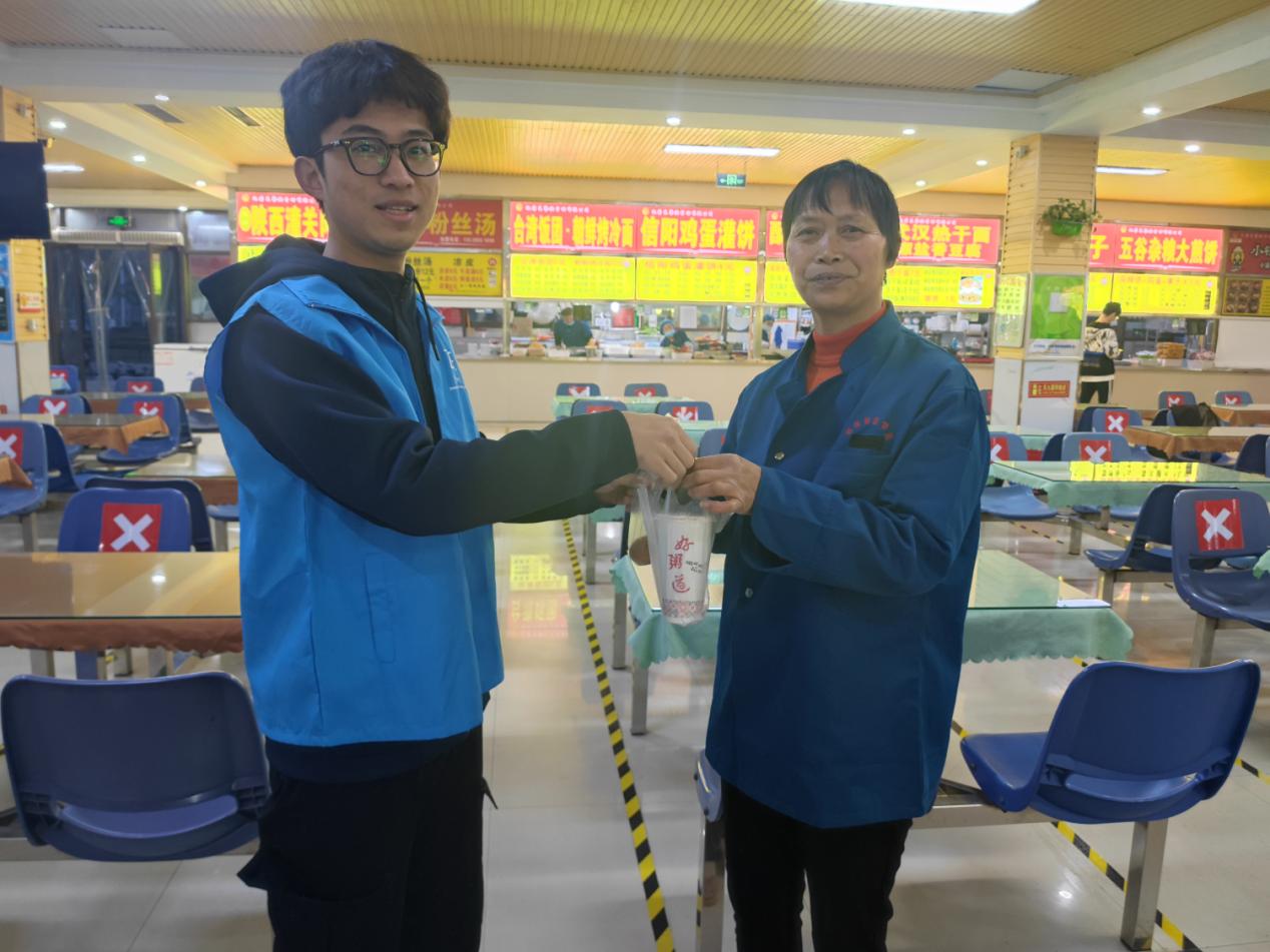 校园里随处可见环卫工人的身影,不论严寒酷暑,她们始终坚守自己的岗位,虽然早上的天气还是很冷,但当阿姨接过同学们手中的爱心早餐时,说“天气虽冷,但是感觉心里特别温暖,谢谢同学们这么关注我们。”看着环卫阿姨们吃得很开心,志愿者们的心里也是暖暖的。