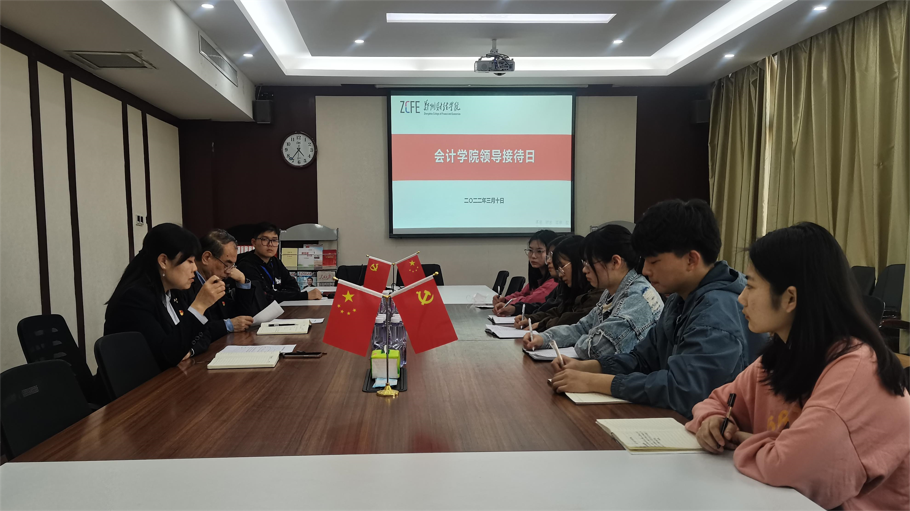 为进一步落实学院《关于完善师生权益维护工作机制的实施办法(试 行)》要求,3月10日下午,会计学院在德信楼308会议室举办本学期首期“院领导接待日”活动。会计学院院长管洲、党总支书记温毓敏与学生代表面对面亲切交谈。