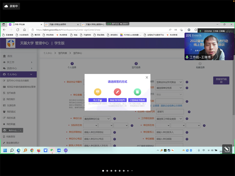 王琳博就双选会报名管理、网上签约、档案查询等方面进行系统培训,详细展示了“工作啦”智慧就业平台学生签约端、企业签约端和院系审核端的具体使用方法,明确网上签约各个环节的操作流程,并对常见问题进行了细致说明。