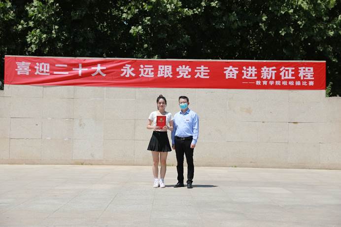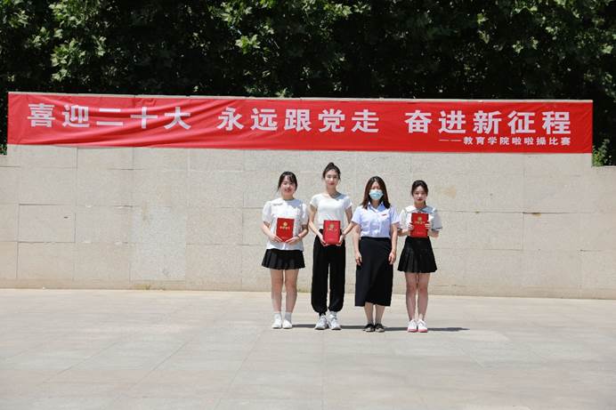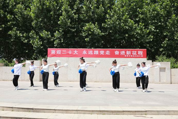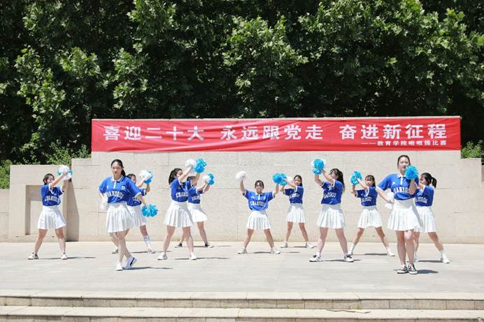 为激励广大青年学生积极参加校园文化活动,营造健康文明的校园文化氛围,弘扬时代精神,激发青春活力,教育学院开展了“喜迎二十大、永远跟党走、奋进新征程”啦啦操比赛。经过激烈的初赛、复赛选拔后,共有六支队伍脱颖而出进入决赛。5月16日中午,教育学院啦啦操决赛在文化广场举行,学院党总支书记丁青山、副院长郑琳娜及全体辅导员现场观看比赛。学院团总支书记崔灿、体育教学部陈雅琪老师、艺术教学部常露文老师、教育学院王越和侯雪妍老师担任比赛评委。