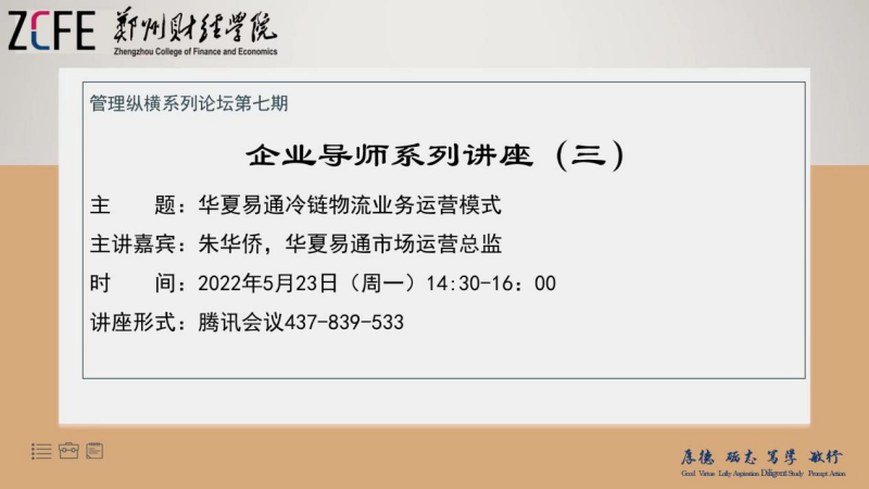 5月23日下午,在管理学院的组织下,管理纵横系列论坛第七期企业导师系列第三讲顺利举行。本次讲座邀请郑州市华夏易通市场运营总监朱华侨先生作题为“华夏易通冷链物流业务运营模式”的线上讲座。物流管理教研室全体教师在德信楼608会议室聆听讲座,60余名学生线上参加讲座。讲座由管理学院副院长胡久贵主持。