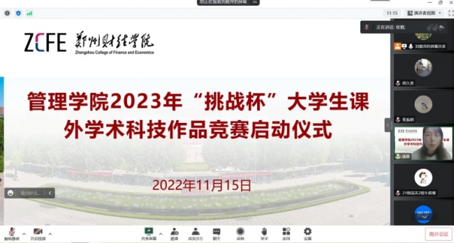 为促进学院学生自主创新能力,营造科研学术氛围,进一步发挥“挑战杯”竞赛的育人作用,加强学院师生对“挑战杯”的认识和了解,11月15日,管理学院召开2023年“挑战杯”大学生课外学术科技作品竞赛启动仪式,本次会议采取线上线下相结合的形式进行,学院全体教师及部分学生代表参加。会议由团总支书记刘雅萍主持。