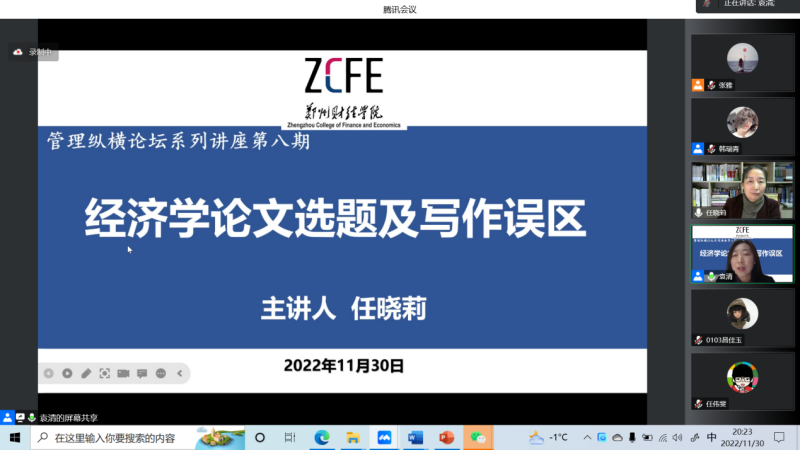 11月30日,管理学院开展管理纵横论坛第八期第二讲,特邀区域经济评论杂志社社长任晓莉以“经济学论文选题以及论文写作误区”为题作讲座,部分学校教师及管理学院师生参与本次讲座。讲座由学院党总支书记袁清主持。