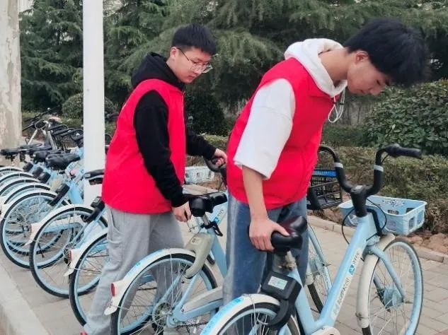 志愿者们热情满满、分工明确,有的对道路上乱停乱放的共享单车进行统一规范的调整,有的借助毛巾、抹布、垃圾钳等清洁工具,对道路两侧、人行道、绿化带里的各个宣传橱窗、休闲娱乐设施等进行清洁整理。志愿者们用自己的实际行动为学校增添一份清新,一抹明亮。