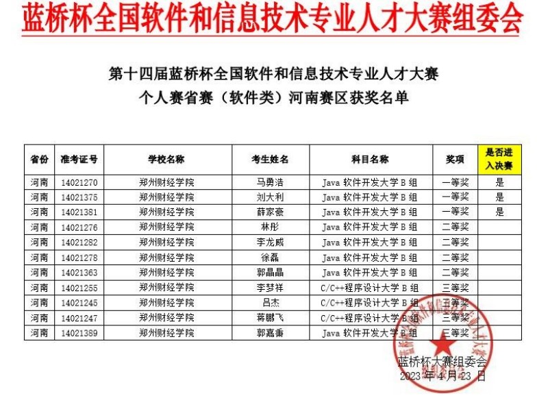 4月8日,“第十四届蓝桥杯全国软件和信息技术专业人才大赛”软件类挑战赛圆满结束,威廉希尔官网信息工程学院软件工程专业11名参赛选手在陈得友、潘笑颜、周聪敏和郭琳琳4位老师的指导下,经过近4个月的准备,连续4个小时的角逐,最终取得了优异的成绩。其中,21软工本2班马勇浩、21软工本1班刘大利、薛家豪同学荣获“Java软件开发大学B组”河南赛区一等奖,跻身全国总决赛;20软工本2班林彤、徐磊,20软工本3班李龙威和20软工本1班郭晶晶4位同学荣获“Java软件开发大学B组”河南赛区二等奖;20软工本1班李梦祥、20软工本2班吕杰、蒋鹏飞3位同学荣获“C/C++程序设计大学B组”河南赛区三等奖;21软工本3班郭嘉秉同学荣获“Java软件开发大学B组”河南赛区三等奖。