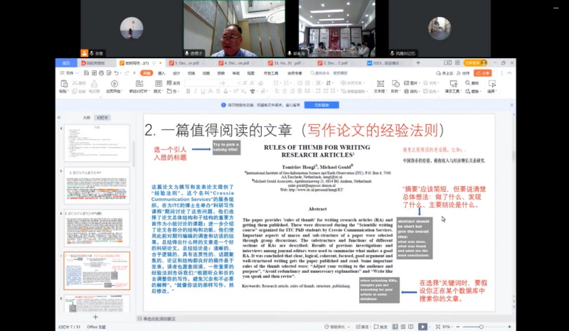 唐德才从论文的选题、摘要、关键词、期刊选择、投稿、修改等方面进行了详细讲解,并结合自己发表的文章举例分析,讲述了论文选题的技巧、写作的重难点,着重阐述了撰写过程中的关键要素和注意事项。他从指导青年教师发表科研论文的实践经验出发,同时结合学院实际情况指出了教师在撰写论文中的短板并提出了针对性的意见和建议。