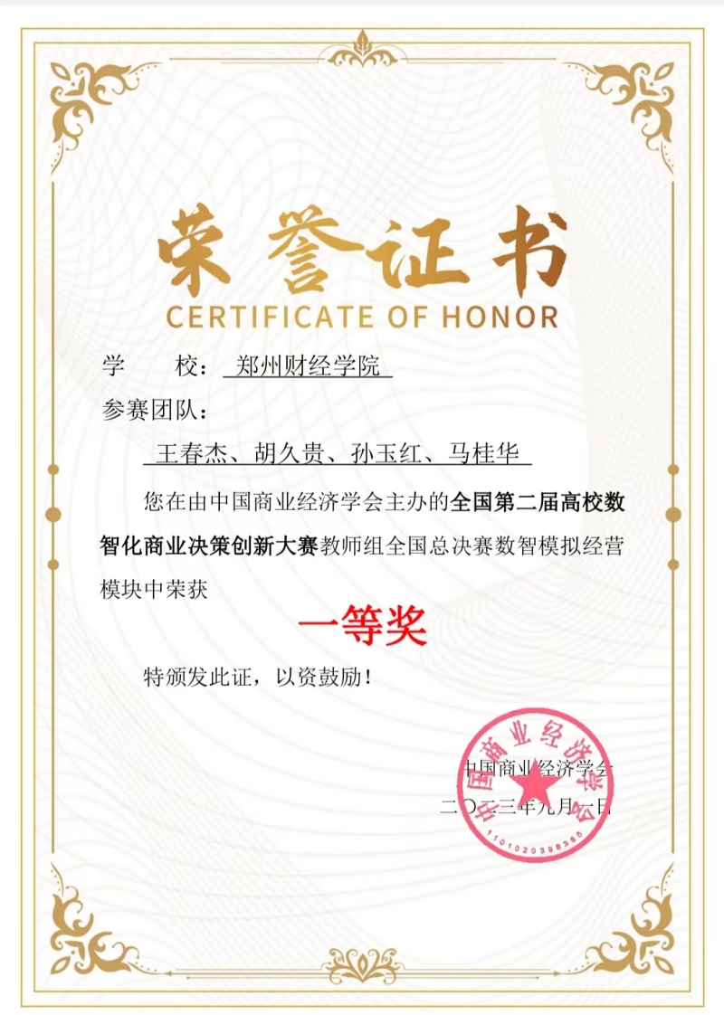 近日,由中国商业经济学会主办的全国第二届高校数智化商业决策创新大赛教师组圆满结束。我校管理学院王春杰、胡久贵、孙玉红、马桂华四位“双师型”教师组成的参赛团队从100多支报名团队中脱颖而出,荣获全国第二届高校数智化商业决策创新大赛教师组全国总决赛数智模拟经营模块一等奖。