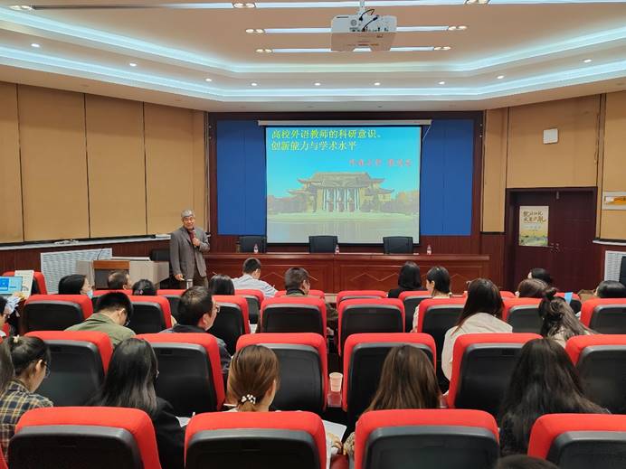 培训过程中,张克定教授为教师们作“高校外语教师的科研意识、创新能力与学术水平”专题讲座。他从高等学校的职能出发,引出高校教师的职责和职业发展,在此基础上,着重分析了如何提升高校教师的科研创新能力,即树立科研意识、培养创新能力、促进学术水平。
