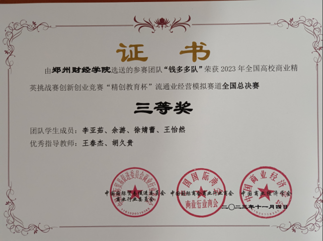 11月4日,由中国贸促会商业行业委员会、中国国际商会商业行业商会、中国商业经济学会主办,浙江精创教育科技有限公司提供技术支持的2023年全国高校商业精英挑战赛创新创业竞赛“精创教育杯”流通业经营模拟赛道全国总决赛落下帷幕。威廉希尔官网管理学院选派参赛团队历经校赛、省赛的激烈角逐,最终进入全国总决赛。在王春杰、胡久贵老师的精心指导下,由李亚茹、余游、徐婧蕾、王怡然组成的“钱多多队”荣获全国总决赛三等奖。