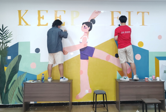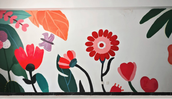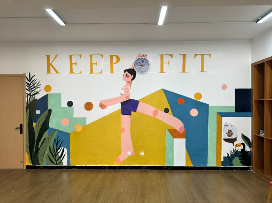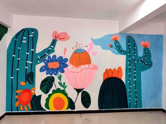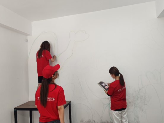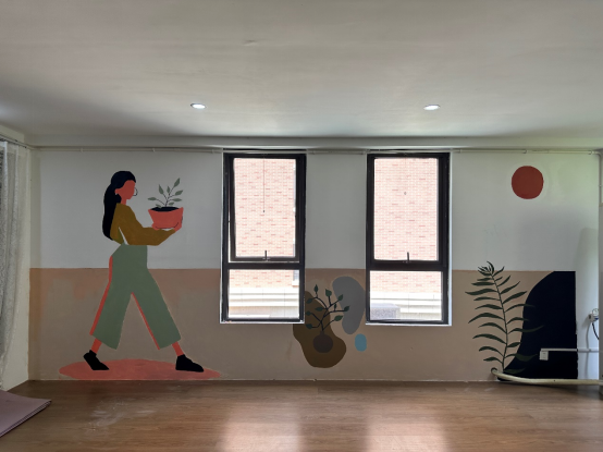 墙绘地点为家河家社区党群服务中心二楼的多功能室,致力于满足社区服务“老幼青妇弱新”群体活动中心的需求,团队师生通过实地查看和商榷,最终确定绘制瑜伽室和手工室,并通过墙体数据测量、结合房间的功能设计画稿、修改方案、确定方案、绘制墙体,将几面原本平白的墙面变得色彩纷呈、主题鲜明,为功能室增添了浓郁的艺术气息。