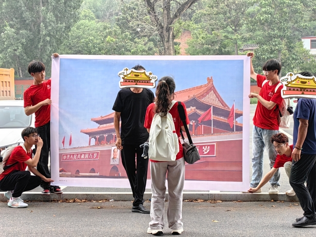 在新中村,实践团成员们拉起一块印有雄伟壮观的天安门场景的巨大幕布。天安门是无数中华儿女的向往之地,当地居民对此很感兴趣,实践团成员们耐心地为每一位想要合影留念的居民拍照,并免费赠送照片,居民们内心被深深触动,脸上洋溢着幸福的笑容。