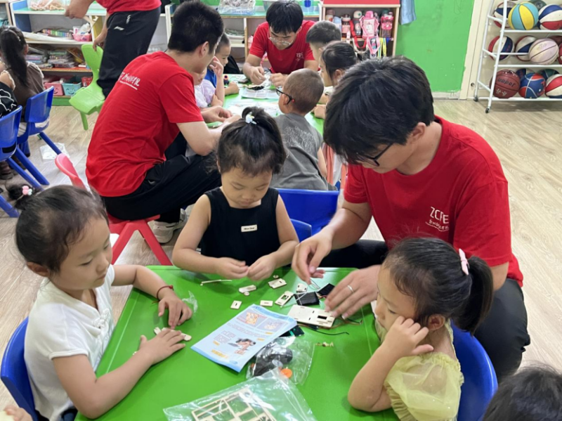 在伟才幼儿园带领小朋友们拼装智能小玩具
