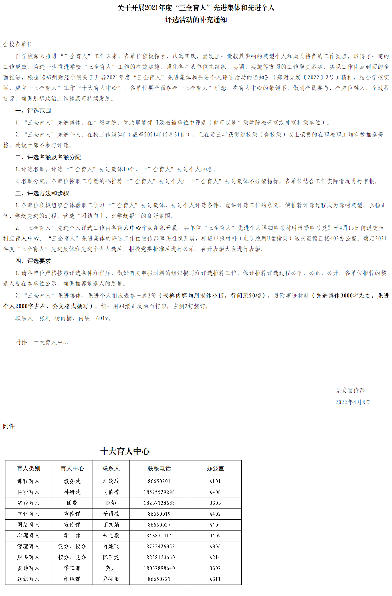 关于开展2021年度“三全育人”先进集体和先进个人 评选活动的补充通知