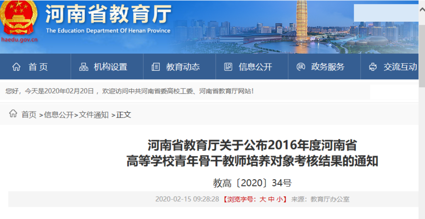 近日,河南省教育厅下发了《关于公布2016年度河南省高等学校青年骨干教师培养对象考核结果的通知》(教高〔2020〕34号),威廉希尔官网省级青年骨干教师王艳杰顺利通过考核。
