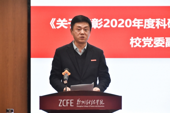 党委副书记董学力宣读《关于表彰2020年度科研先进集体和先进个人的决定》。监事会主席李庆阳宣读《关于奖励2020年度优秀科研成果的决定》。