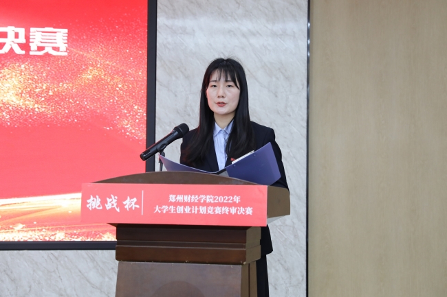 副校长陈静致开幕辞。她对参加终审决赛答辩的团队表示祝贺,表示学校高度重视大学生创新创业工作,积极开展“挑战杯”等赛事活动,全面落实立德树人根本任务。她指出,在喜迎党的二十大和建团百年之际开展本次竞赛,旨在引导广大郑财学子做敢闯敢试的开拓者,激发干事创业的热情,争做脚踏实地、开拓创新的时代新人。她对参赛学生提出了三点希望和要求:一是转变思维,提高创新意识;二是努力学习,提升创新能力;三是脚踏实地,投身到创新创业实践中去。