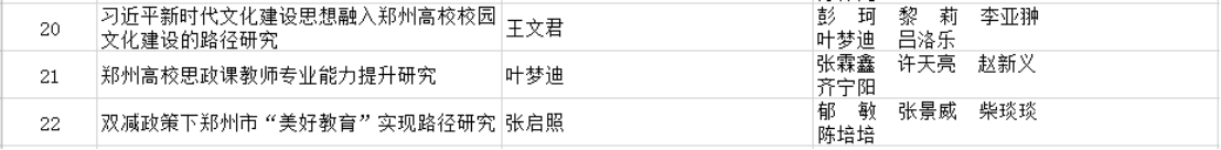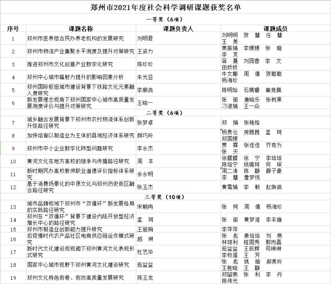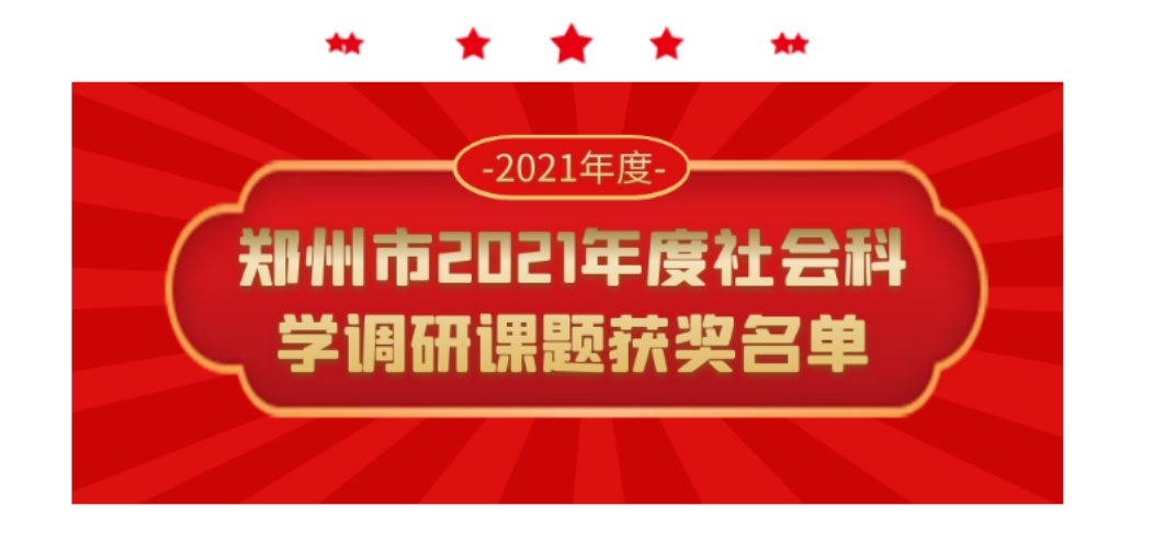 郑州市社会科学优秀成果评奖委员会于6月16日公布了“郑州市2021年度社科调研课题结项、获奖暨2022年度课题立项评审公示”。根据《郑州市哲学社会科学优秀成果评奖办法》(郑办〔2009〕40号)规定,经郑州市社会科学优秀成果奖评审委员会评定,威廉希尔官网共有22项课题获评郑州市2021年度优秀社会科学调研课题,其中一等奖6项、二等奖6项、三等奖10项。