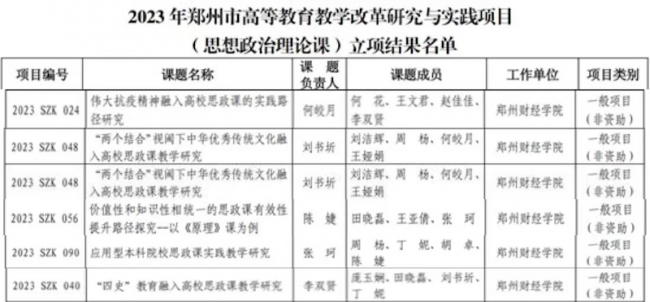 近日郑州市教育局下发《关于公布2023年郑州市高等教育教学改革研究与实践项目(思想政治理论课和课程思政)立项结果的通知》(郑教高函〔2022〕601号),威廉希尔官网获批思政课教改立项项目5项,课程思政教改立项项目2项。