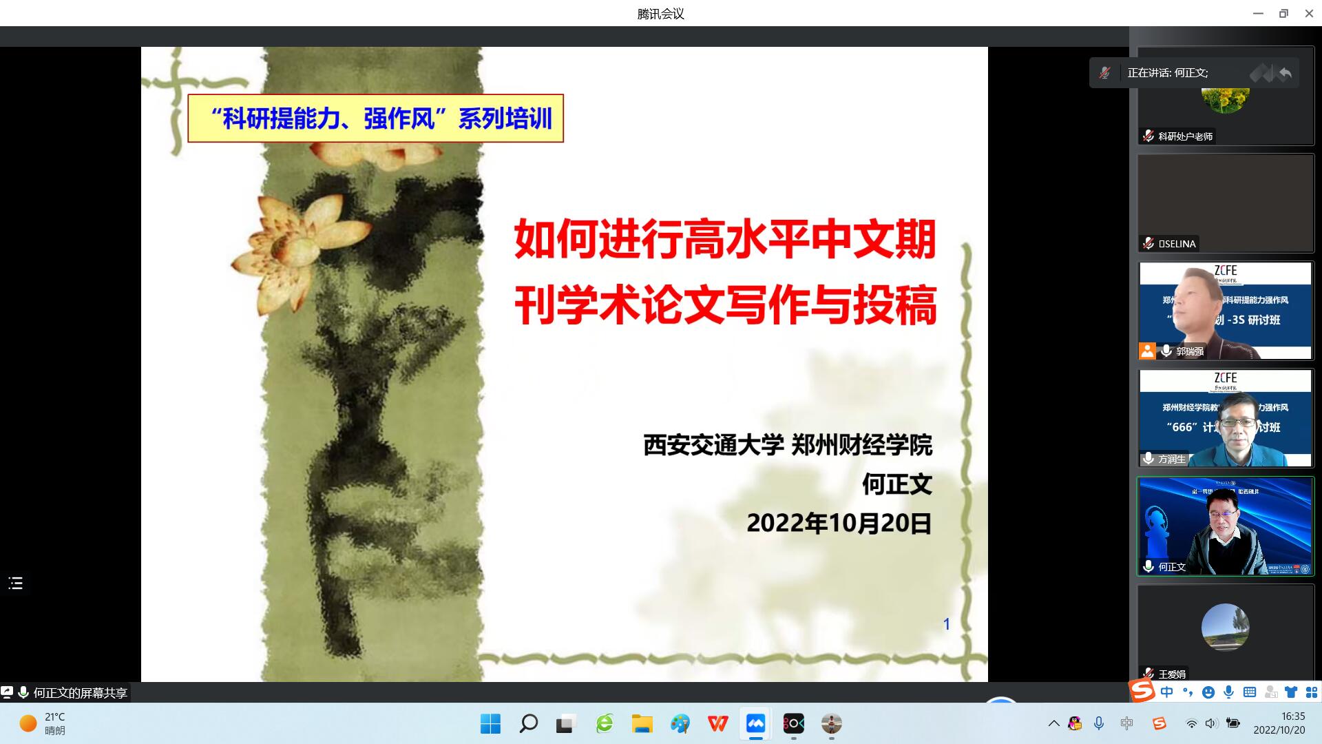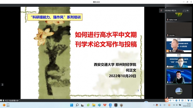 10月20日下午,威廉希尔官网科研提能力强作风“666”计划3S研讨班培训第五讲——《如何进行高水平中文期刊学术论文写作与投稿》培训会通过线上举行。有关校领导,3S研讨班全体学员参会。西安交通大学教授、博士生导师、全国工程管理专业学位研究生教育指导委员会委员何正文进行培训。会议由副校长方润生主持。