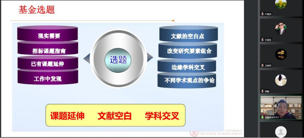 齐保垒教授以“创新思想”“研究实力”和“写作技巧”为切入点,明确了基金申请的三要素。他指出,好课题是在对学科的深刻理解下产生的,选题要坚持问题导向,提高对学术领域、政策动向、行业发展实际的关注度和敏感度,在选题的需求性、创新性、科学性、可行性上下功夫。在具体讲解科学基金申请书重点内容的撰写要求及注意事项过程中,齐教授结合自身研究方向,以国家级项目申报书为范例,逐一剖析了科学基金项目名称、摘要、立项依据、研究意义、文献综述、研究内容、技术路线图、可行性分析、项目特色及创新点、研究计划及预期成果等重要步骤及其写作技巧。他强调,申报科学基金项目要建立清晰明确的研究目标,要善于运用图表展示项目的研究逻辑,做到思路好、材料独特、方法新颖独到;要保持研究定力和耐心,用心、反复打磨基金项目申报书,力争将高水平研究项目呈现在评审专家面前。随后,齐教授与学员进行了线上互动,针对学员提出的相关问题进行一一解答。