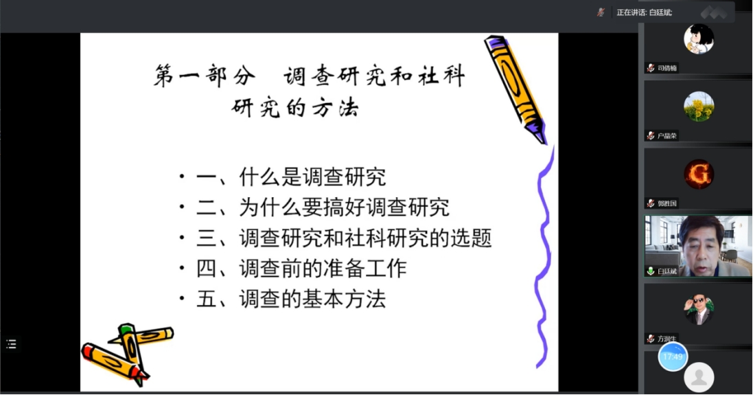 白廷斌主要围绕“调查研究和社科研究的方法”“调查报告和社科研究报告的写作”和“实例分析”三个层面展开培训讲解。他强调,调研报告的主要功能是为有关党政机关领导进行有效决策服务的,是为促进经济社会发展服务的,因此要确立“身在兵位,胸为帅谋”的工作思想,明确撰写调研报告的目标和立场。要完成高水平的调研报告,需要做好扎实详备的调查研究,要对获取的第一手材料进行分析、归纳、提炼,将感性认识上升为理性认识;需要关注聚焦实际工作中的“大事”“难事”“新鲜事”,寻找社会需求、紧跟实践步伐;需要处理好调研课题“大和小”“当前和长远”“冷门和热门”等方面的关系,运用科学、务实、高效的调查方法,拓展调研的视野,增强调研的厚度与深度。并以相关优秀调查报告为案例,深入分析解读了调查报告的定义和特点、结构和写法,社科研究报告的基本内容和结构,书写调查报告的步骤及写作要求。